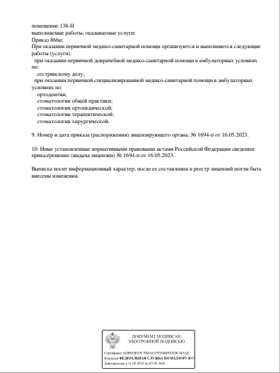 Проводит консультации, лечение кариеса, отбеливание зубов, профессиональную гигиену, лечение дёсен, реставрацию зубов, лечение каналов зубов, лечение под закисью азота, лечение под седацией, рентгенологию и КТ.