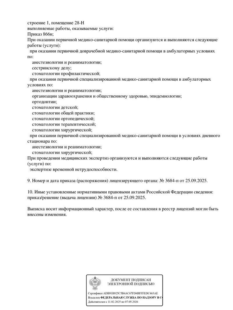 Проводит консультации, лечение кариеса, отбеливание зубов, профессиональную гигиену, лечение дёсен, реставрацию зубов, лечение каналов зубов, лечение под закисью азота, лечение под седацией, рентгенологию и КТ.